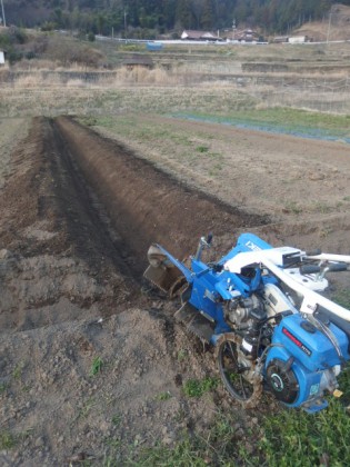 先日結構深く掘った溝、幅50cm。 トラクターで踏み固められてガチガチに固くなった耕盤が見えます。 それを幅17cmの・・・ 溝きりローターで更に深く掘り下げます。 管理機で何度も往復して少しずつ。 1本掘り上げるのに2 […]